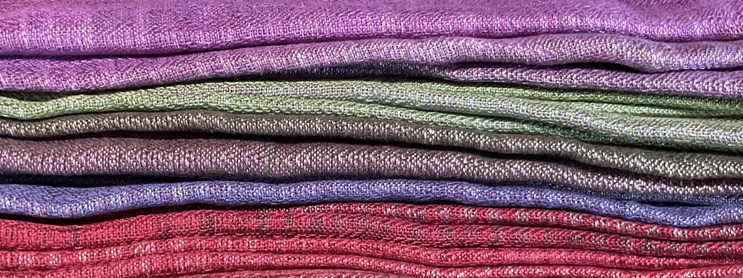 In 7th grade, our sewing teacher uncovered my talent for sewing a straight line. Eventually this line of thread wound itself around most of the clothing I made and wore. In my thirties I discovered weaving provided a new twist. I could actually make the fabric. Over thirty years later I continue to create fabric by dying the yarns and weaving these yarns into shawls, scarves, towels, table runners, and placemats.