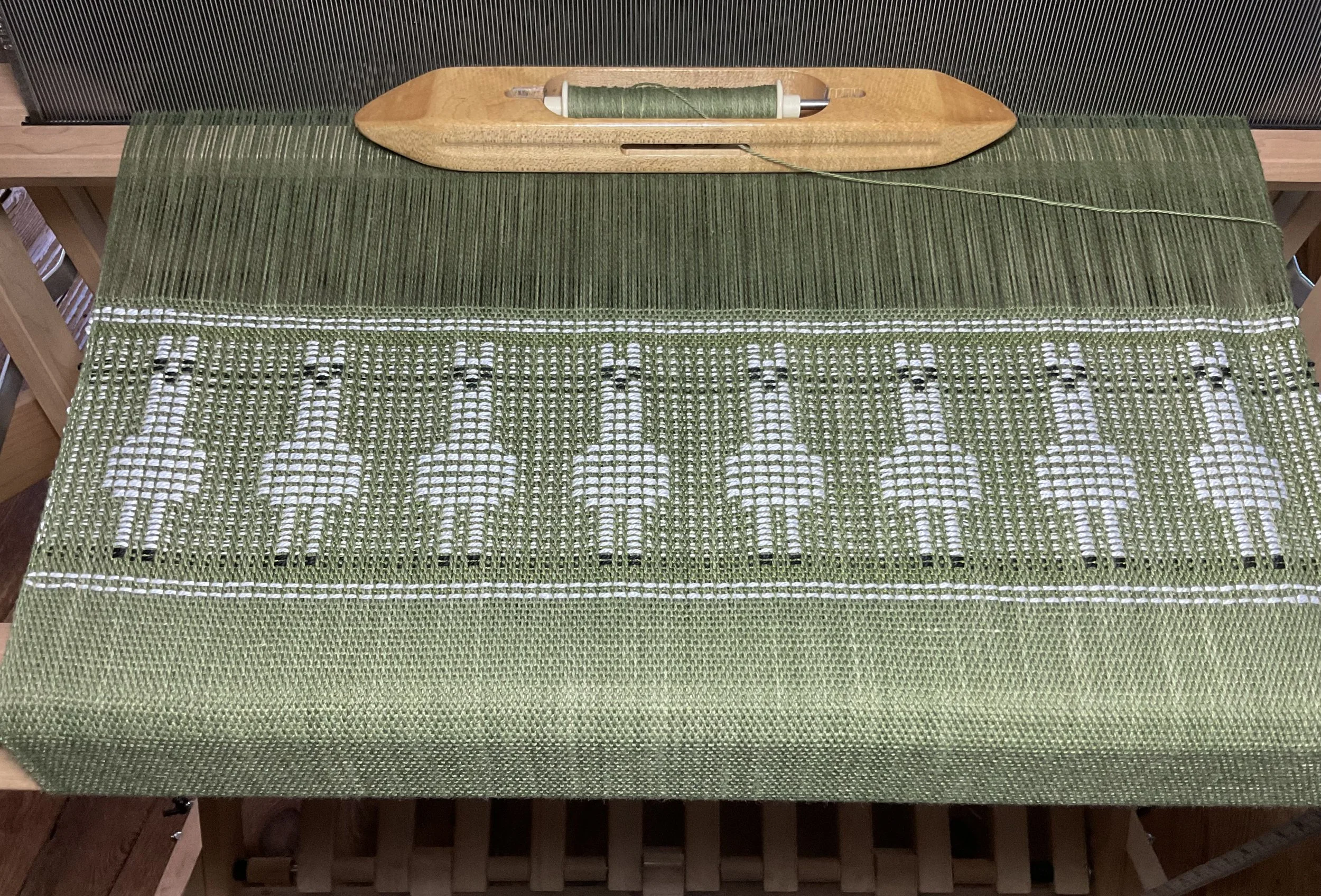 What I like is not needing to hold the cross in my hand for either front to back or back to front warping. I can easily adjust the sticks so one is above the other and at the level that works for me. You can also adjust the height of the shafts and your seat. I use a lower chair for threading heddles and then the bench when threading the reed. There is one image with a view showing part of the lease sticks while I am threading the heddles back to front.